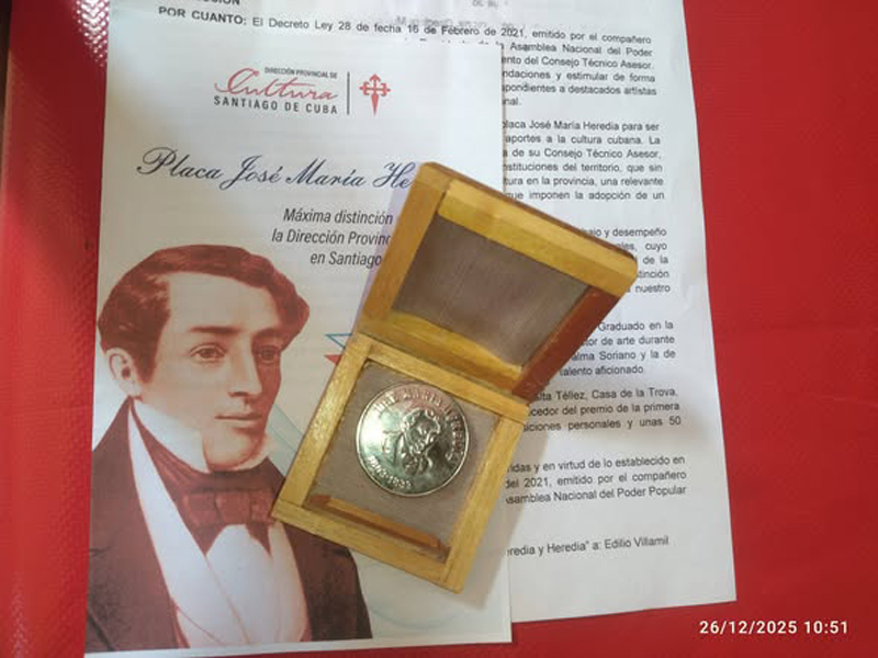 Palma Soriano.- En emotiva ceremonia en el Salón del Gobierno local de este territorio del oriente cubano, Edilio Villamil Fajardo, pintor; y Teresa Méndez, trovadora, y pintora del movimiento Arte Naif recibieron hace pocas horas aquí la placa José María Heredia y Heredia que otorga el Consejo de Estado por las excepcionales trayectoria de ambos al arte palmero y nacional. En el caso de Teresa, esta acogió la distinción en su hogar por razones de salud.